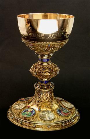 Verguld zilveren kelk met pateen en lepeltje. De pateen is aan de bovenzijde gedecoreerd met een rijke gravering met in het midden een grote medaillon omgeven door vier kleinere medaillons met daarin de symbolen van de vier evangelisten afgewisseld door bloemmotieven. Aan de onderzijde van de pateen is een klein medaillon gegraveerd met daarin de buste van Christus. De kelk heeft een grote ronde voet, gedecoreerd met in totaal acht medaillons, telkens een gouden afgewisseld door een medaillon uitgevoerd in emaille. De stam bestaat uit een nodus met daar boven en onder een blauwe band met tekst. De cuppa is tot halverwege druk gedecoreerd, de andere helft is glad met een gegraveerde, rondomlopende inscriptie. Vele stenen zoals saffieren, smaragden, robijnen en geel en wit gekleurde stenen zijn in de kelk verwerkt. De lepel is eveneens met witte stenen versierd, heeft een gedraaide met parelrand gedecoreerde steel en een gladde bak.