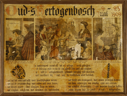 Uitgegeven ter gelegenheid van het 25-jarig ambtsjubileum van Burgemeester P.J.J.A.M. van der Does de Willebois. Opschrift: "Oud-'s-Hertogenbosch 9-23/juni 1909". Onderschrift: "Hij draait voir 't oipen raem/sijn potten seer bequame/En sal uijt simple kleij/veel arbeitseer versaemen. Die Busscher scolieren singhen in Kercken ende goidshuijsen ofte opter straeten/bij 'vallen/vanden avend/geestelijke sanghen/seght Molius in sijnder Kronijcke Caput primum. Was constig spellewerck de huijs-arbeit der vrouwen/Sunt Jan is doir haer mans/met cant van steen behouwen. In somermaent coomt all/tot s-Hartogs Bosch getoghen/Met bliscap ende vreucht/en gheeft den cost uw ooghen/Op oudt-s-Hartogenbosch/gebouwt soo ghij sult mercken/Daer ruerlincx bij Sunt Jan/de costlijckste aller kerken. Daer sal het const-ambacht/weer hoochtijdaghen vieren/Daer sal de coopmanschap/naer ouden aert weer tieren/Daer blasen pipere(n)/daer clinghen fluijt en veelen/Daer singhen sangheren/met stemmen als meistreelen. Daer treckt een ommeganck/daer comen princhen binnen/Daer doen retorisijns/een constig spul-van-sinnen/Daer vendlen cloeveniers/Maer waertoe langher kallen? Coomt binnen doir die poirt/Het sal U welgevallen".