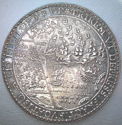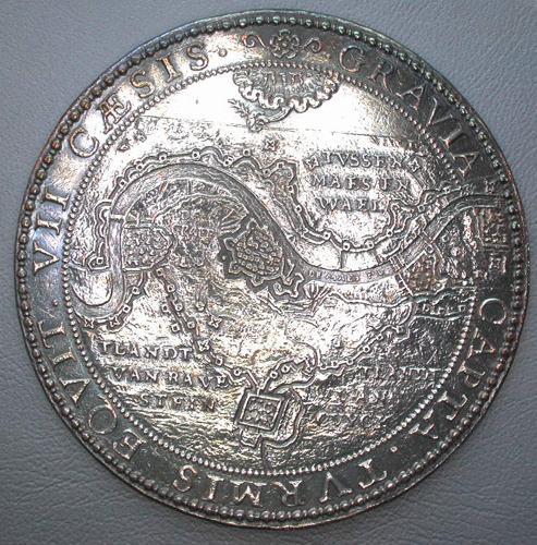 Grave veroverd, 7 ruiterbenden verslagen en 6 galeien overzeild, verbroken en verjaagd zijnde, hebben in het jaar 1602 de Staten der verenigde gewesten deze doen munten