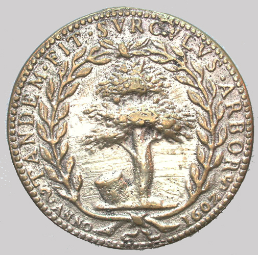 Kz: binnen een lauwerkrans een tweestammige boom, waarvan één stam is afgezaagd; omschrift: TANDEM.FIT.SVRCVLVS.ARBOR/ANNO.1602
