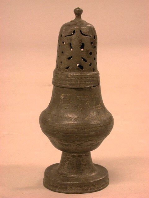 - BeschrijvingIn Lodewijk XVI-stijl. Ronde geprofileerde voet, bolle buik, op de bolling enkele geprofileerde randen. Los deksel, uitgesleten schroefdraad. Onderrand deksel geprofileerd gezaagd strooigaatje bolvormig knopje. . Opschrift: afkorting Hebreeuwse lofzegging vertaling: "de specerijenreuk wordt opgesnoven".