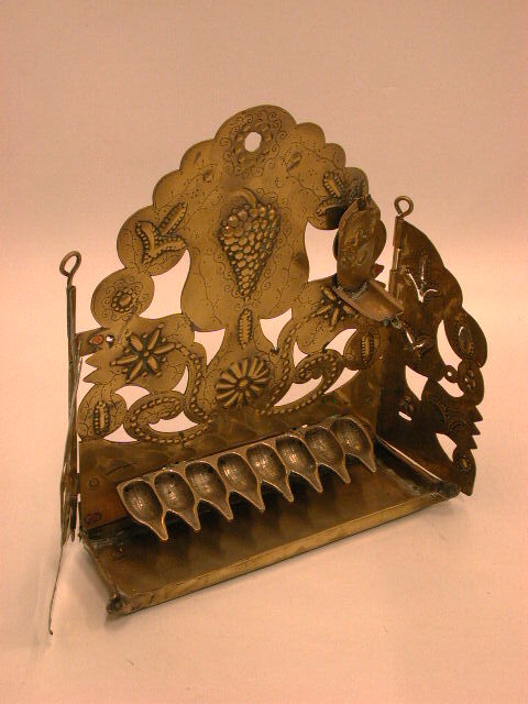 Acht aan een stuk gegoten oliehouders, bevestigd aan een koperen achterplaat met gegraveerde en gedreven ranken bloemdecoratie (w.o. een centraal geplaatste gedreven druiventros), daarmee harmoniërende uitsnijdingen waaronder een ophangoog en een halfronde, gelobde bovenzijde. Langs de onderzijde van de plaat een rechthoekige lekbak, langs de beide zijkanten een scharnierende tochtklep die naar voren kan worden geklapt en is uitgevoerd met dezelfde decoratiemotieven als de achterplaat. Rechtsboven aan de achterplaat een haak waaraan een uit plaat gebogen 9e oliehouder (de knecht of Sjammos). Een sterk gelijkend exemplaar is afgebeeld in het artikel van E. van Voolen, Antiek, januari 1986.