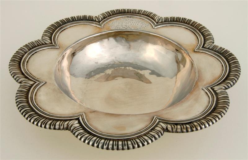 Aan de bovenzijde van de schaal de gegraveerde wapens van de schenkers Dirck Wijntrack en Anna van Brockhuijse, omgeven door bladranken. Het wapen Wijntrack bestaat uit twee wijnranken die die om een stam geslingerd zijn het wapen van Brockhuijse is doorsneden: I in zilver negen hermelijnstaartjes, geplaatst 5 en 4 II effen. Het doopbekken is gemerkt Adriaan van Sgravenweert