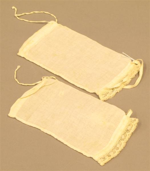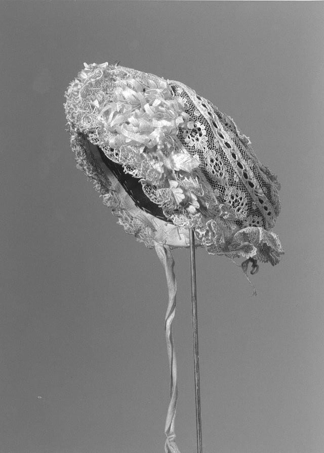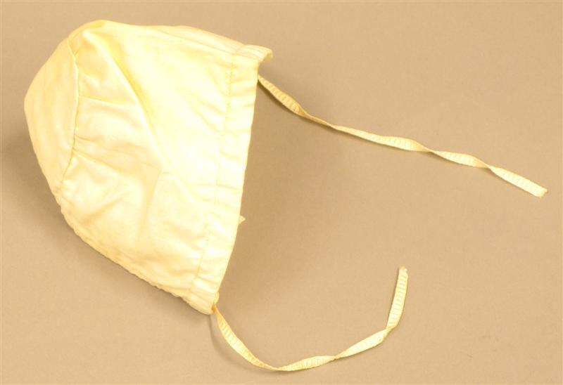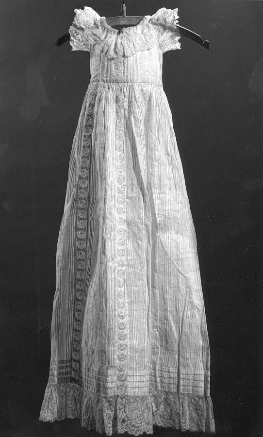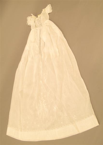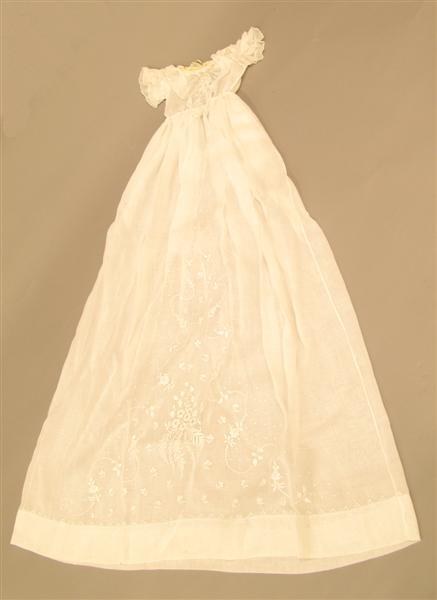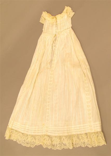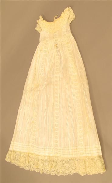 Doopjurk van gebroken witte katoen met losse mouwtjes, mutsje en ondermutsje en doopsprei. Jurk: gemaakt van gebroken wit katoenen stof met ingeweven satijnstrepen. De stof is in brede banen verwerkt. Tussen de banen zijn stroken broderiekant gezet (kant met bloempatroon). Het lijfje is versierd met vertikale koppeltjes (smal in voorpand, breder in achterpand). Langs de halsopening een strook brede machinale kant. Tunneltje langs halsopening met doorgeschoven fantasiebandje. Wijde, aangerimpelde rok met 3 opnaden boven de zoom en een brede strook machinale kant (als boven) langs de zoom. Split middenachter tot diep in de rok. Sluiting met 2 parelmoeren knoopjes en 2 knoopsgaten, bovenaan met bandje. Losse mouwtjes van gebroken wit katoenen batist, langs de onderkant afgezet met een machinaal kantje. Langs boven- en onderkant een tunneltje met een doorgeschoven bandje. Jurk licht gesteven. Machinaal genaaid. Mutsje en ondermutsje: Mutsje samengesteld uit aan elkaar genaaide machinale kantjes (valencienne en laize-frou-frou met doorgeschoven band), cremekleurig. Langs de rand, rondom het gezicht, 3 geplooide strookjes tule met kant, waartussen lusjes van zijden satijnband. Over de aanzetnaad van de strookjes een gedraaid zijden bandje. Middenboven een rozet van tule met kant en zijden band. Middenachter op de bol een rozet van kant. Zijden striklinten. Met de hand genaaid. Ondermutsje van creme satinet met doorgeschoven bandjes langs voor- en onderkant. (Bandje langs voorkant identiek aan bandjes uit onderkant van de mouwtjes). Machinaal genaaid. Doopsprei: Creme doopsprei van machinale katoenen tule met machinaal geborduurde bloementakken. Omzoomd met een brede strook machinale kant en gevoerd met katoenen satijn. Met de hand genaaid.