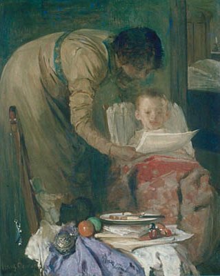 - BeschrijvingEen vrouw, gekleed in een lichte japon, buigt zich over een kindje dat in rode dekens gewikkeld is en in een stoel zit. Rechts een doorkijkje naar de slaapkamer. De vrouw laat het kind enkele blaadjes papier zien.