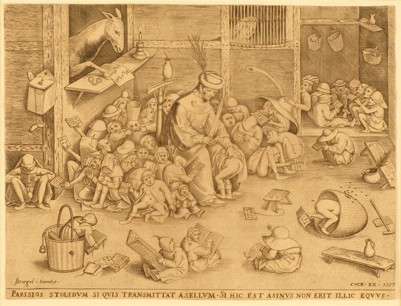 Onderschrift: "PARISIOS STOLIDVM SI QVIS TRANSMITTAT ASELLUM. SI HIC EST ASINVS NON ERIT ILLIC EQVVS."// Al reyst den esele ter scholen om leeren/ist enen esele hij en sal gheen peert weder keren.