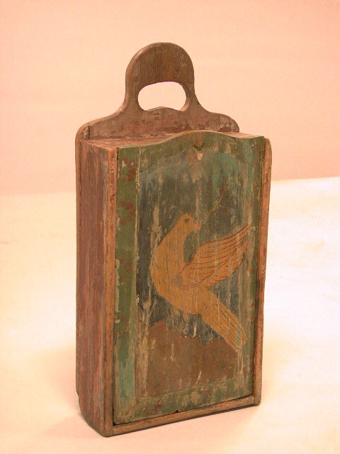 - BeschrijvingEiken tas met schuifklep. Van buiten rood geverfd en van binnen donkergroen. Op de schuifklep is een gele duif geschilderd tegen een voornamelijk groene achtergrond. De achterwaard van de kast loopt naar boven door tot een hengsel.