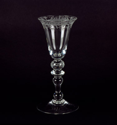 - BeschrijvingSierbokaal op platte voet. Geleden stam met ronde en plat bolle knoppen. Kelkvormige cuppa met sierrand. Radgravure met bloem- en vogelmotieven.