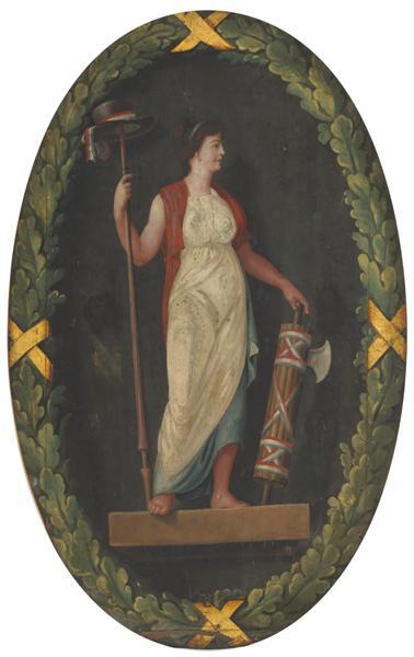 Gevelbord met voorstelling van de vrijheidsmaagd met hoed op speer en fasces (roedebundel met bijl). Dit bord bedekte in de Bataafse tijd (van 1798 tot 1801) het stadswapen van 's-Hertogenbosch in het fronton van het stadhuis in plaats van het weggekapte stadswapen. De vrijheidsmaagd en de bijbehorende symbolen verzinnebeelden de vrijheid die de overheid bij de uitoefening van haar macht dient te inspireren.
