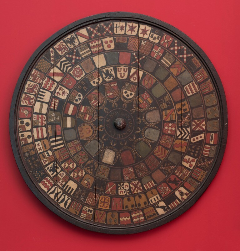 Rond tafelblad, afkomstig uit de gaffelkamer in het stadhuis te 's-Hertogenbosch. Dit vertrek was vroeger bestemd voor vergaderingen van de broederschap of het gilde der Gaffelbroeders. De gaffelbroeders waren voorname heren uit 's-Hertogenbosch en de Meierij. In de 15de en 16de eeuw zouden zij de verdediging van hun streek tegen de Gelderse invallen hebben voorbereid. Ook hoge edelen, waaronder vliesridders, woonden de feestelijke maaltijden van dit gezelschap bij. Hun wapens staan afgebeeld in het midden van de wapenborden. Het blad was oorspronkelijk tegen het plafond van deze kamer bevestigd. Beschilderd met de wapens van de Gaffelbroeders, afkomstig uit adelijke en andere voorname families uit 's-Hertogenbosch. Opschrift in het midden "ANNO.1693.VERNIUT."