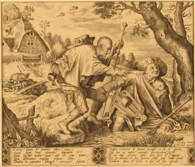 Twee blinden lopen door een landschap, de een leidt de ander. Als de eerste in het water valt zal ook de tweede in het water vallen. Ze zijn uitgedost als pelgrims (Jakobsschelp), maar ook als bedelaars. De voorste man heeft een draailier. Op de achtergrond vallen twee blinden in een put (zie Mattheus 15:14: indien een blinde een blinde leidt zullen zij beiden in een put vallen). Eerste staat van 5