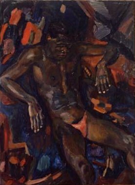- BeschrijvingTegen een bonte achtergrond ligt een donkere man te rusten, gekleed in een lendedoek.