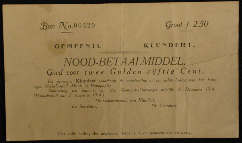 Noodgeld uit de gemeente Klundert ter waarde van 2,50 gulden