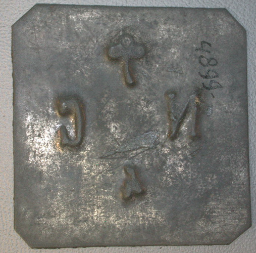 - BeschrijvingBlikken plaatje van 4 laken voor de bevrijde zwarte vrouwen te Suriname, welke wekelijks tegen geld werden ingewisseld. De plaatjes van de mannen waren rond, die van de vrouwen waren vierkant.