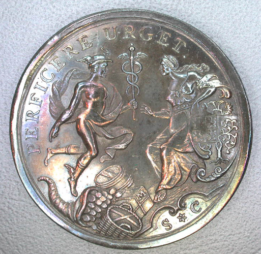 Kz:vliegende Mercurius, zijn staf in de linkerhand, wijst de zittende stedemaagd aan. Haar linker arm rust op het stadswapen. Op de grond liggen een hoorn des over¬vloeds en enkele koopwaren. Op de baal de letter M; opschrift: PERFICERE URGET; in de boogsgewijze afsnede de letters S?C