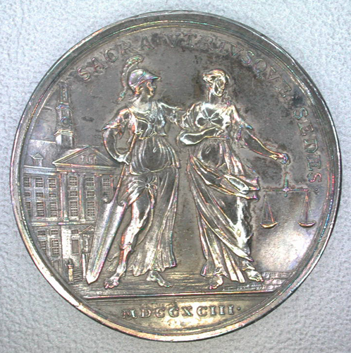 Kz:de stedemaagd, gezeten op een stapel boeken, houdt in de linkerhand een speer met vrijheidshoed, heeft haar gezicht van de vrijheidshoed afgewend en wijst met de rechterhand op PRIVILEGIËN, BLIJDE INKOM¬STEN, GILDEKAARTEN en CAPITULATIE; opschrift: ME FIRMATA FIRMIO¬RA; in de afsnede: MDCLXXXV./T.V.B.