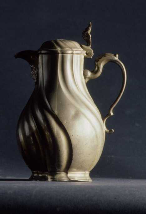 - BeschrijvingEen Hollandse getorste tinnen kan samengesteld uit drie verticaal gegoten delen en met vierkakig scharnier met palmetvormige handgreep.