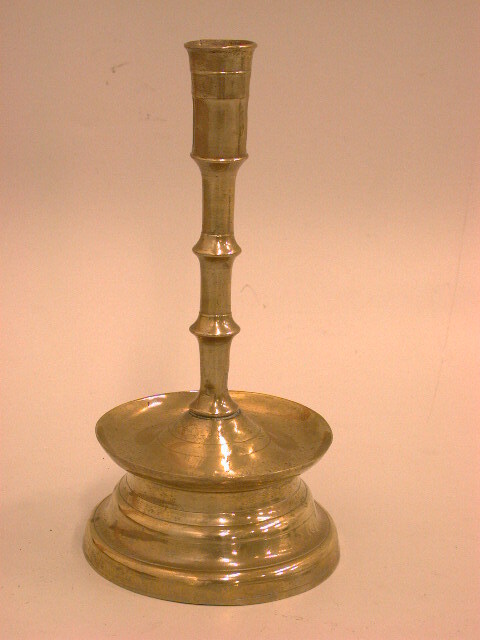 - BeschrijvingHoge gewelfde konische voet, afgedekt door wijde schaalvormige vetvanger. Uit vetvanger oprijzende flauwe kegelvorm, waarop stam met 2 niet scherp geprononceerde platte knopen en overgaand in nagenoeg gladde houder met staand-rechthoekige zijgaten, waarboven nog een klein rond gat.
