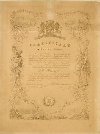 - TitelOorkonde van een officier der Noord Brabantse Vrijwillige Jagers (1831-1839)