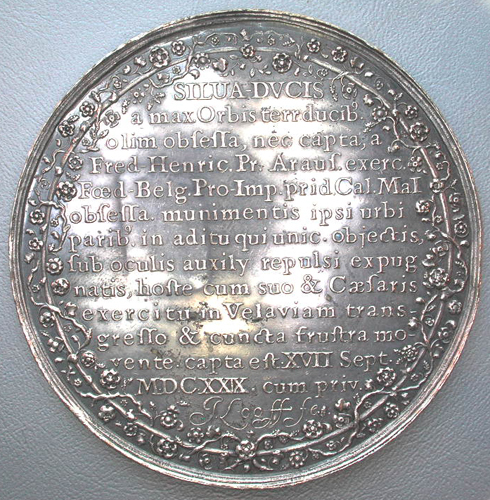 Kz:: binnen een bloemenkrans een opschrift in het Latijn, waarin melding wordt gemaakt van de inname van Den Bosch door Frederik Hendrik, en het monogram LVT