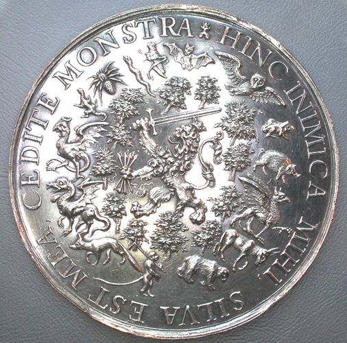 Vz: de Nederlandse leeuw verdrijft gedrochten uit een bos (Den Bosch); omschrift: HINC INIMICA MIHI, SILVA EST MEA, CEDITE MONSTRA