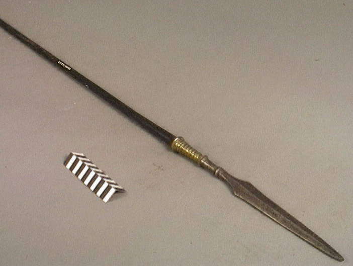 Werpspeer gemaakt van hout van de kokospalm en aan het ondereinde verzwaard.