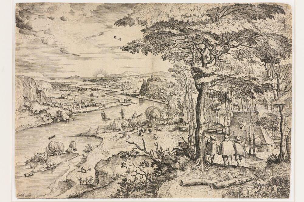 Gezicht op een landschap met een dal waardoor een rivier loopt. Aan weerszijden van de rivier rotspartijen. Verder zijn in het landschap te zien:huizen, bomen, mensen, vee, rechts in het midden een kasteeltje en aan de horizon een ondergaande zon. Rechts op de voorgrond lopen drie mannen in de richting van een groepje huizen. De middelste heeft een aureool om zijn hoofd. Op de voorgrond een boom die een groot gedeelte van de prent in beslag neemt.