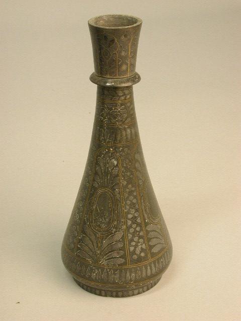 - BeschrijvingPeervormig vaasje op voetring. Hoge, slanke hals met twee profielranden en licht trechtervormig uitlopend. Florale decoraties, gegraveerd, in friezen en velden over hele oppervlak. Zwart patina.