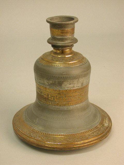 - BeschrijvingKlokvormige fles met vlakke bodem en halfhoge smalle hals- versierd met gegraveerde ornamentbanden met o.a. visgraat-, meander- en spits- boogmotieven. In lichaam en hals één ingelegde geelkoperen band. (vgl. NN 39)