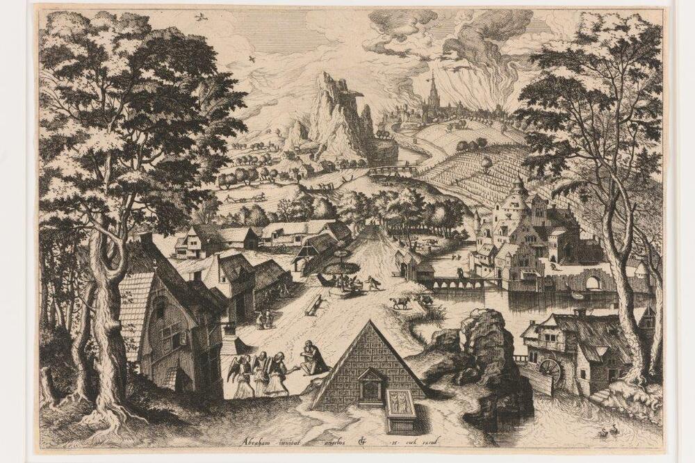 - BeschrijvingPanoramisch landschap met de ontmoeting tussen Abraham en de engelen. Als nevenscène: Abraham brengt eten naar de engelen. Onderschrift m.o.: Abraham invitat angelos