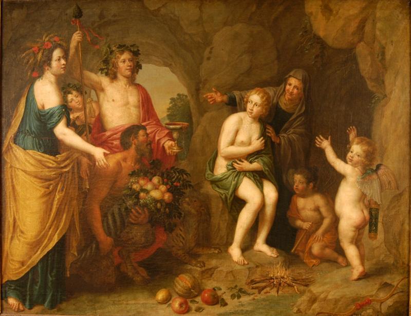 - BeschrijvingMythologische voorstelling op het adagium uit Terentius' Eunuchus: 'Sine Cerere et Liber friget Venus' (zonder Ceres en Liber staat Venus in de kou) Links: Ceres, Bacchus, Faun Rechts: Venus, Eros, Amor, Liber (?)