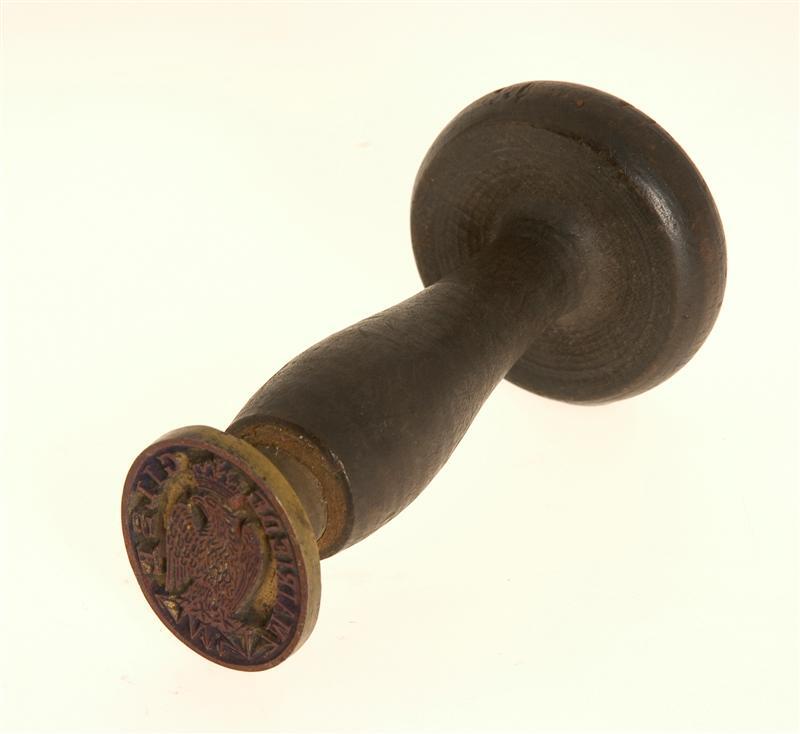- BeschrijvingOvaal koperen inktstempel van de gemeente Gilse: In het midden de afbeelding van een gekroonde keizerlijke adelaar, met bliksemflitsen. Randschrift: MAIRIE DE GILSE Op de achterzijde is een houten handvat in een ronde huls bevestigd.