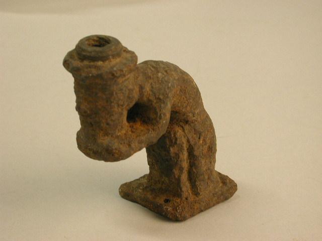 Handvat in de vorm van een zittende, gebogen man. Oudheid min of meer twijfelachtig. Schroefdraad in hoofd.