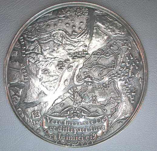 Vz: plattegrond van de omgeving van Bergen op Zoom en de Zeeuwse wateren, op een draperie onder de voorstelling een legenda van de afbeelding; opschrift: VERE SURREXIT DEUS / ET DISSIPARI SUNT / INIMICI EIUS