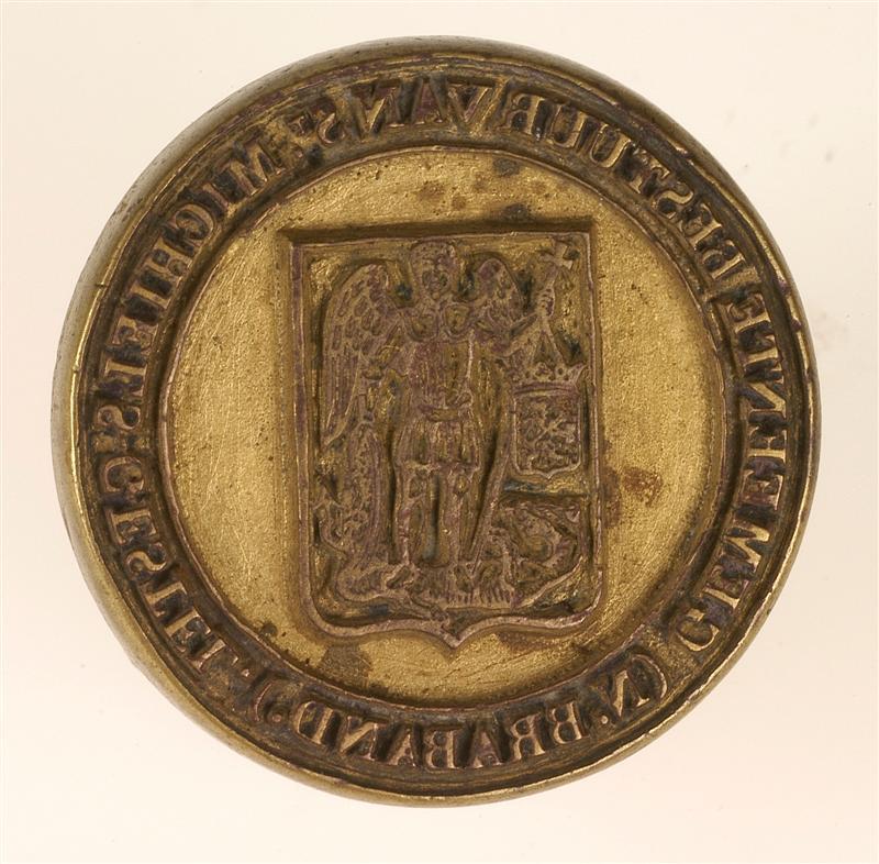 Inkststempel van St. Michielsgestel: Op een accoladevormig schild de afbeelding van een gevleugelde engel, staande op de buik van een op zijn rug liggende leeuw. In de ene hand een kruisstaf, in de andere een schild. Rechtsmidden een klein ingezet schildje met een klimmende leeuw, gekroond. Op de achterzijde een korte koperen huls, waar een handvat in bevestigd heeft gezeten. Randschrif: GEMEENTE BESTUUR VAN ST.MICHIELS.GESTEL ( N.BRABAND)