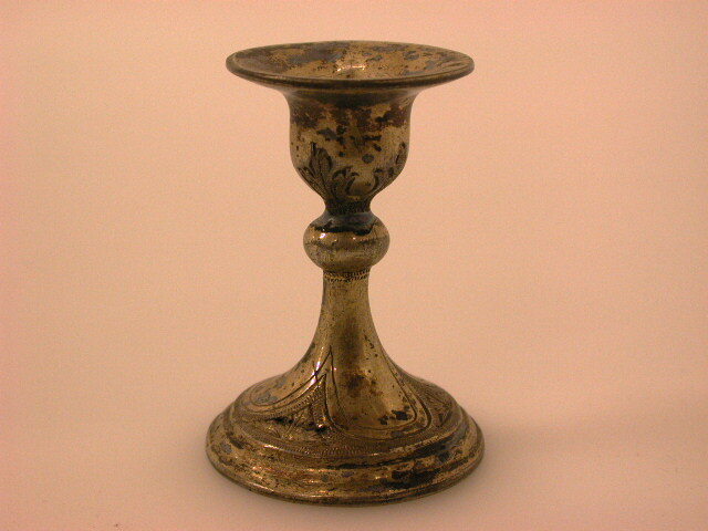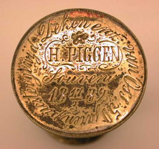 - BeschrijvingMinitiatuur kelk met kegelvormige voet, overgaand in slanke steel met ronde nodus, direkt onder de cuppa met horizontaal uitlopende rand. Op voet en kelkvoet gegraveerde florale motieven. Onder de voet: H. Piggen Souvenir 18 17/3 82 Deken enz. van Oss/50 jaren priester gewijd