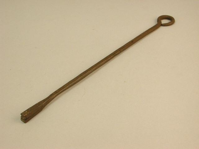 - BeschrijvingBrandmerkijzer die de afdruk DR in een cirkel nalaat. Op lange pin. Het merk zit in reliƫf op een ronde dop op een stevige staaf die in een punt eindigt. De letters 'DR' staan voor 'Dinther'.