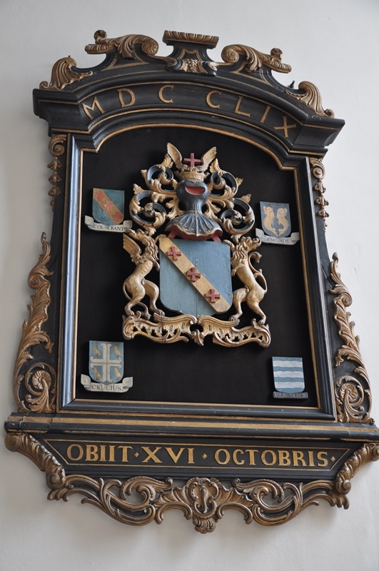 Op de gebogen bovenlijst: MDCCLIX. Op de onderlijst: OBIIT XVI OCTOBRIS. Centraal geheel in reliƫf uitgevoerd wapen Cousebant, met zwart gekroonde helm met rode opening en een rood kruis tussen gouden vleugels als helmteken, alsmede een afgewende griffioen en leeuw als dragers. De vier kwartieren, vlak en beschilderd: 1. Cousebant: gouden schuinbalk met 3 rode Griekse kruisen op een blauw veld 2. Emonds: twee paalsgewijs afgewende gouden vissen op zwart. Van Beeck: drie zilveren gegolfde balken op blauw. Crucius: zilveren ankerkruis, waartussen 4 gouden zangvogels (lijsters?) op een blauw veld