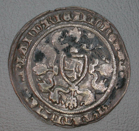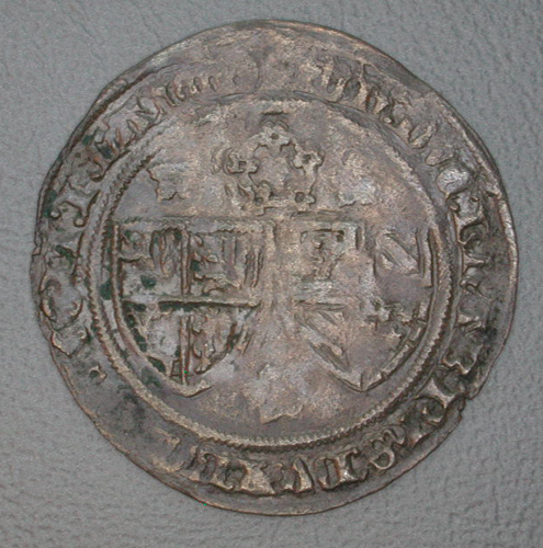 Keerzijde: binnen een parelrand een gebloemd kruis, beladen met het Brabantse wapen, met omschrift.