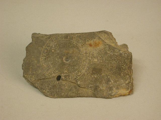 - BeschrijvingVierkante loden plaat met driehoekig, vooruitstekend geelkoperen schaduwblad. Op de plaat kloksgewijs, van linksonder naar rechtsonder, romeinse cijfers van V (a.m.) tot VII (p.m.). Middenonder een zon en CIL/1797