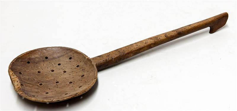 Ovale spaan met 18 gaten. Steel met haakvormig uiteinde