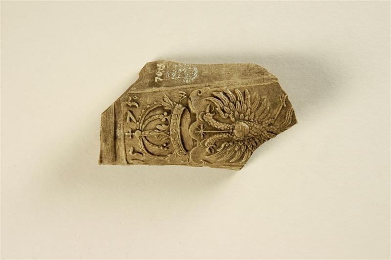 - Beschrijving- wit steengoed versierd met de tweekoppige adelaar, rijksappel en kruis onder een kroon, het jaartal 1575 en de letters L W