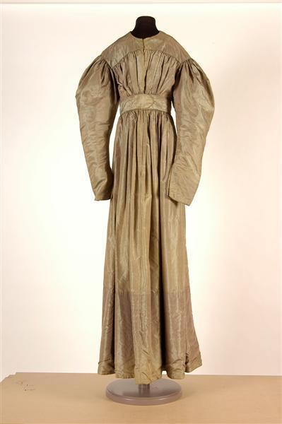 Zijden japon van taf changeant, ketting beige/bruin, inslag groen. Model het hoge tailleband en rechte schouderpas, waartussen een gerimpeld lijfje, schapeboutmouwen en een aangerimpelde lange rok. Het rugpand bestaat uit twee delen met een naad in het midden. De japon wordt middenvoor gesloten. De schouderpas sluit middenvoor met twee koperen haakjes en twee genaaide trensjes, de tailleband met drie koperen haakjes en twee koperen ogen, en een ingenaaid trensje. Bijna alle naden van het lijfje zijn versierd met rolzoompjes. Het lijfje, de tailleband en de mouwen zijn gevoerd met beige katoen. Aan de voorzijde van het lijf bestaat de voering uit twee losse pandjes, komend vanuit de zijnaden, die middenvoor gesloten worden met vijf koperen haken en ogen. De mouwsplitten sluiten onderaan met drie koperen haakjes en drie genaaide trensjes. Langs de onderrand van de mouwen is een extra voering van zijde (dezelfde als van de jurk) genaaid. Langs de onderrand is de rok over een breedte van 32 cm gevoerd met changeant katoen (ketting groen, inslag beige/bruin), midden achter is een stuk effen katoen tussengevoegd. Over de naad middenvoor (van de voering) een groen bandje. Op de binnenzijde, middenachter op de tailleband, een lusje van groen band.