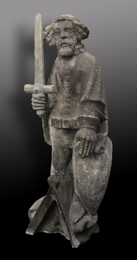 - BeschrijvingTopbekroning voorstellende een man met schild en opgeheven zwaard op dakvormig voetstuk. Man, blootshoofds met baard, lijfrok met heupgordel en wijde mouwen, maliƫnbroek en hozen, zwaard en schild. Dit standbeeld is afkomstig van de derde luchtboog, onderste rug, noordzijde van het koor. Het is na 1909 afgenomen en met gips (schild en zwaard) aangevuld.