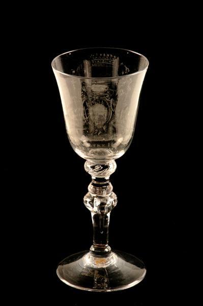Konische voet. Stam met ringvormig voetje, omgekeerde baluster met ingestoken luchtbel en vloeiend, licht ingesnoerde eikelnodus met ingestoken luchtbellen in de kop. Trechtervormige cuppa. Gravure: voor: Wapen mannelijke halffiguur uit water oprijzend (meerman?). Onderschrift: "Cornelis Baayen/ Heemraad op den Hoogen / Maasdyck van Stadt en / Lands van Heusden / Anno 1765". Achter: Ovaal wapen met Pruisische adelaar tussen twee zittende wildemannen. Onderschrift: "Haare Koninglyke Hoogheid / Mevrouwe de Princesse van / Oranje en Nassou / Gebooren Princesse van Pruissen".