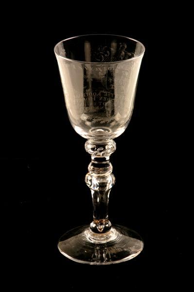 Konische voet. Stam met ringvormig voetje, omgekeerde baluster met ingestoken luchtbel en vloeiend, licht ingesnoerde eikelnodus met ingestoken luchtbellen in de kop. Trechtervormige cuppa. Gravure: Voor: gevierendeeld wapen met l.b. en r.o. 3 raderen, r.b. en l.o. een haas bij een kool. Onderschrift: "Ioost Govertse Kollhaas / Heemraad op den Hoogen / Maasdyk van Stadt en landen / van Heusden Anno 1772. Achter: landschap met links een met twee paarden ploegende boer voor een korenveld met schoven en maaier, rechts een melkster en twee koeien onder een boom. Kopschrift: LAND EN VEE BOUW".