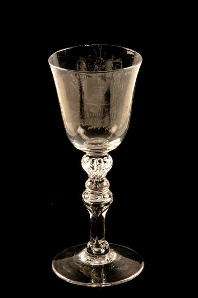 Konische voet. Stam met ringvormig voetje, omgekeerde baluster met ingestoken luchtbel en vloeiend, licht ingesnoerde eikelnodus met ingestoken luchtbellen in de kop. Trechtervormige cuppa. Gravure: voor: Wapen burchttoren met vuurbaak. Onderschrift "Abraham van Baak / Heemraad op den hoogen Maasdyk / van stadt en Landen van Heusden / Anno 1773" Achter: landschap met links een met twee paarden ploegende boer voor een korenveld met schoven en maaier, rechts een melkster en twee koeien onder een boom. Kopschrift: 'LAND EN VEE BOUW'
