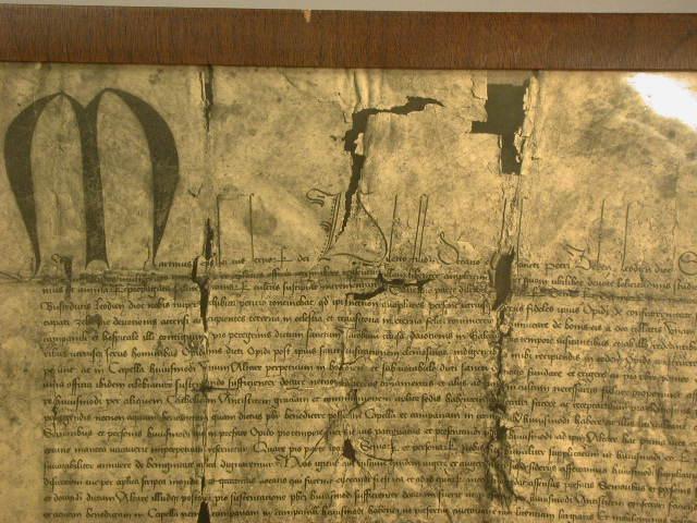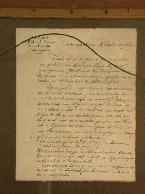 Foto van het Pauselijk stuk de dato 1430 waarbij de stichting van de St. Jacobskapel wordt gedeclareerd