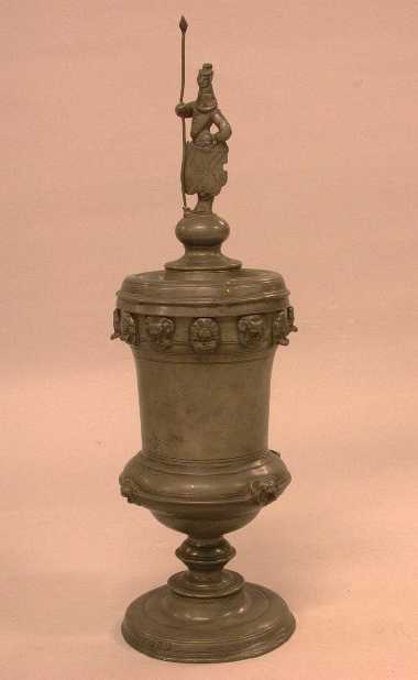 Grote gildebokaal met deksel, op ronde geprofileerde voet en schacht. Cuppa is aan de verbrede onderrand versierd met 4 lauwerkopjes, aan de ook bredere bovenrand met 12 deze leeuwkopjes waren bestemd voor schildjes. Onder enkele van de bovenste reeks staat 1655, 1655, 1655 gegraveerd. Voor in de cuppa is in een lauwerkrans een schild gegraveerd met jaartal 1628 en een winkelhaak met nog twee stukken gereedschap, vermoedelijk het embleem van een timmermansgilde. Binnen de lauwerkrans staat bovendien de naam HINRICH SCHACHT. Onder de voorstelling staat: GODTKE RIBBEKEN. Op de deksel, rijk geprofileerd en bekroond met een bal, staat een als burgerman uitgedoste figuur, met dolk aan de gordel, met een speer in de rechterhand en met de linkerhand leunend op een schild, waarop haak en passer boven het jaartal 1628. In cuppa en deksel het oude inv.nr. 6 in witte verf