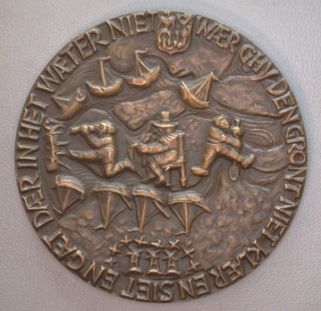 Vz: Portret van Jacob Cats 3/4 naar rechts. Daarboven het opschrift Langs de onderrand silhouet van Brouwershaven, geboorteplaats van Jacob Cats. Kz:De kaart van Zeeland, waarop de plaats van Brouwershaven is aangegeven door het stadswapen. In het midden drie figuurtjes die de bezigheden van Cats als schrijver raadpensionaris en advocaat, als boer en tuinarchitect en als bedijker weergeven. Daaromheen het omschrift.